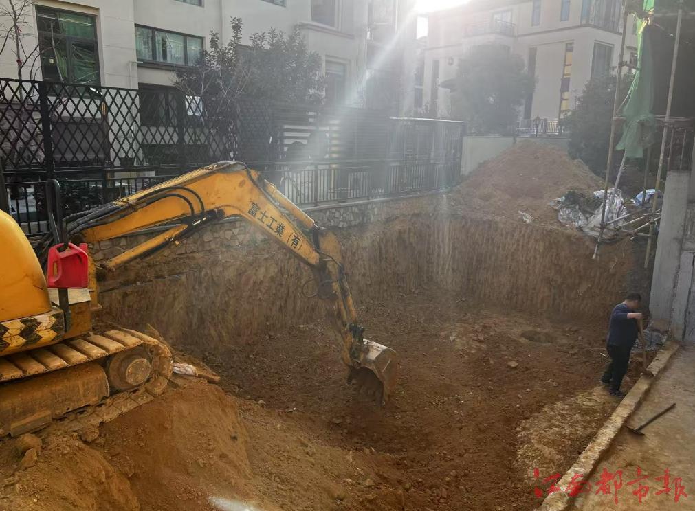 針對(duì)市民反映的情況,記者隨后前往漢港凱旋城別墅區(qū)調(diào)查發(fā)現(xiàn),28棟正在熱火朝天地施工。挖機(jī)揮動(dòng)鐵臂,將院子開挖出近2米深的大坑,涉及面積約50平方米,此外該棟房屋還拆除數(shù)面墻體,進(jìn)行整體裝修。“我們并不是挖地下室,而是對(duì)水管進(jìn)行重新布局,因?yàn)槔系乃軌牡袅?,房子原本就是帶地下室的,不存在擴(kuò)建問題。”現(xiàn)場(chǎng)一名熊姓施工人員說。