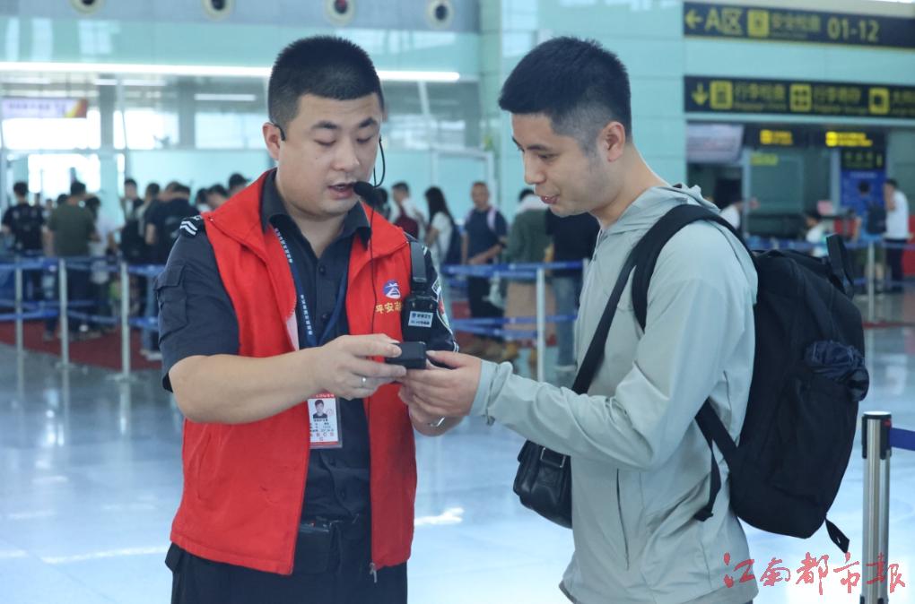 ▲ 南昌昌北國際機場工作人員為旅客檢查充電寶是否合規(guī)。