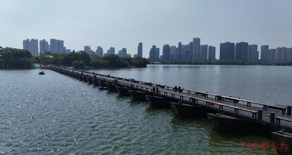 南昌首座鋼架浮橋竣工 39艘浮船托起“水上書廊”